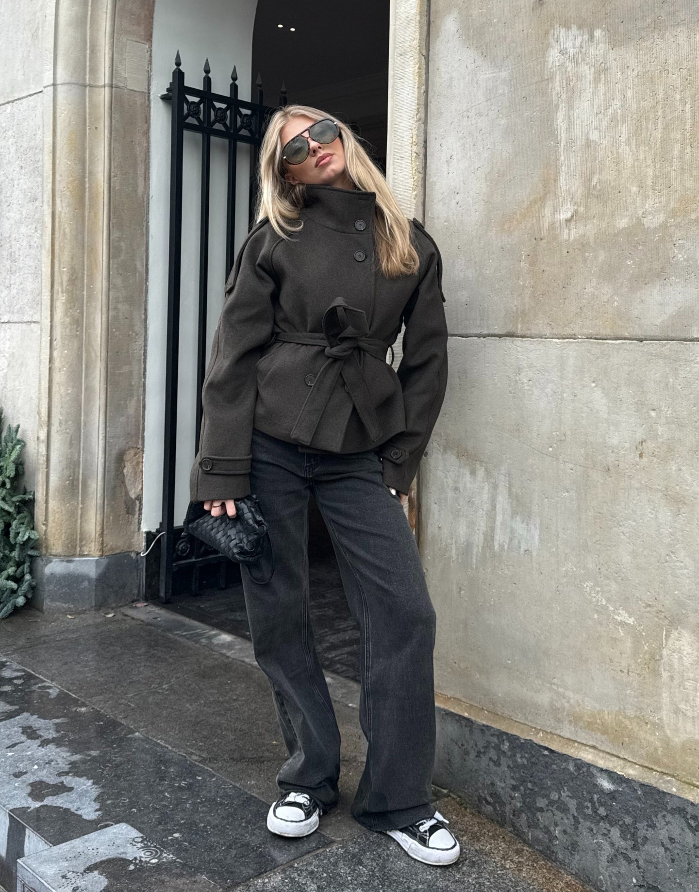 - Was advies: handwas- Droger: nee- Details: knoop sluiting / echte zakken / schouder detail / ceintuur / gevoerd / knopen detail / hoge brede kraag- Model lengte: 173cm- Model draagt: maat S