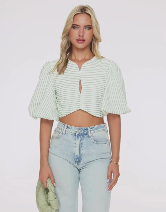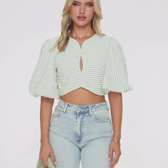 - Details: cropped model / puff sleeves / open back / round neck / button closure and tie closure at the back / cut-out at the front / small V-neck