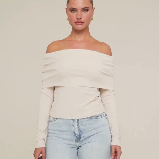 - Was advies: handwas- Droger: nee- Details: off shoulder / omgeslagen detail / gebreide stof / aangesloten model / lange mouwen- Model lengte: 173 cm- Model draagt: maat S