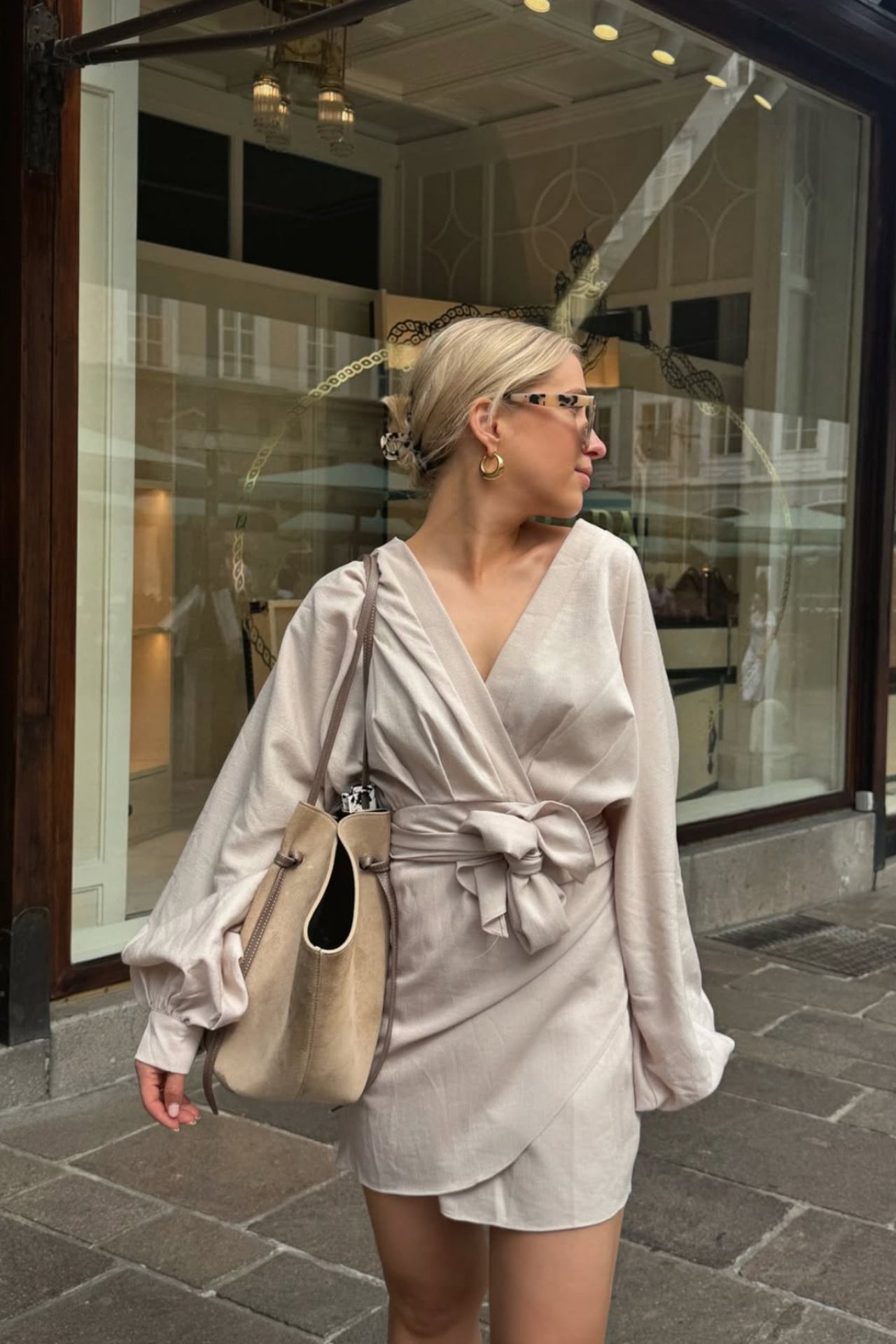 Art. Nr. : 12503- Was advies: handwas- Droger: nee- Details: overslag model / lange mouwen / v hals / knopen uiteinde mouw- Model lengte: 173 cm- Model draagt: maat S