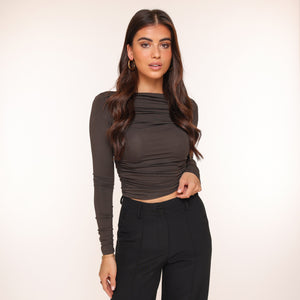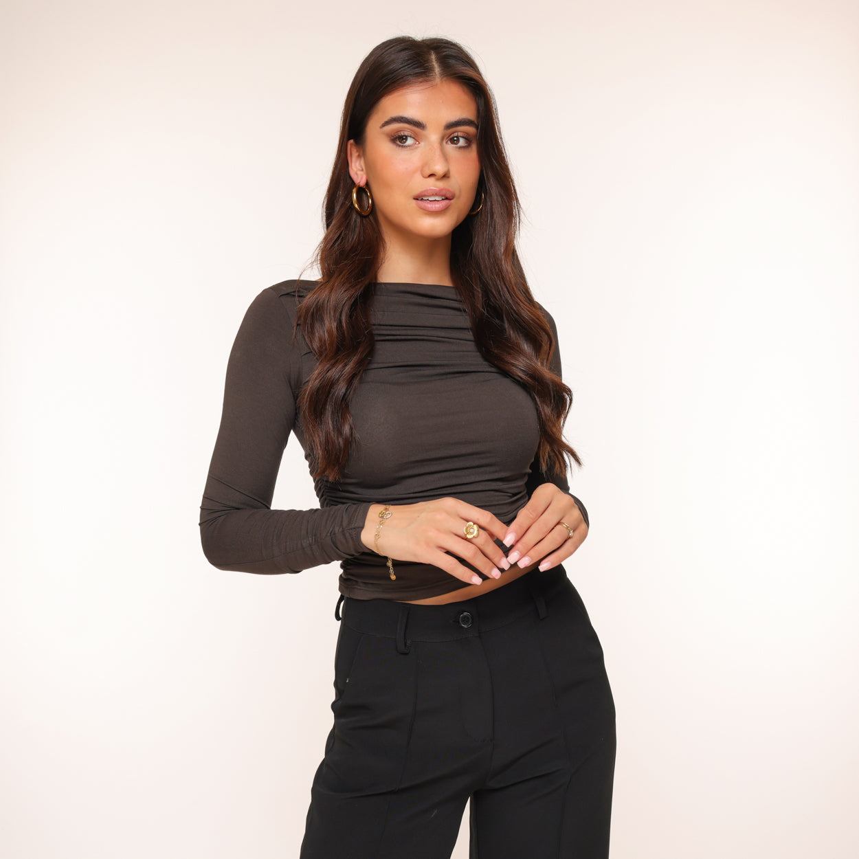 Art. Nr. :12775- Wasadvies: 30 graden- Droger: nee - Details: off shoulder / lange mouwen / veel stretch / gedrapeerde look - Model lengte: 173 cm- Model draagt: maat S