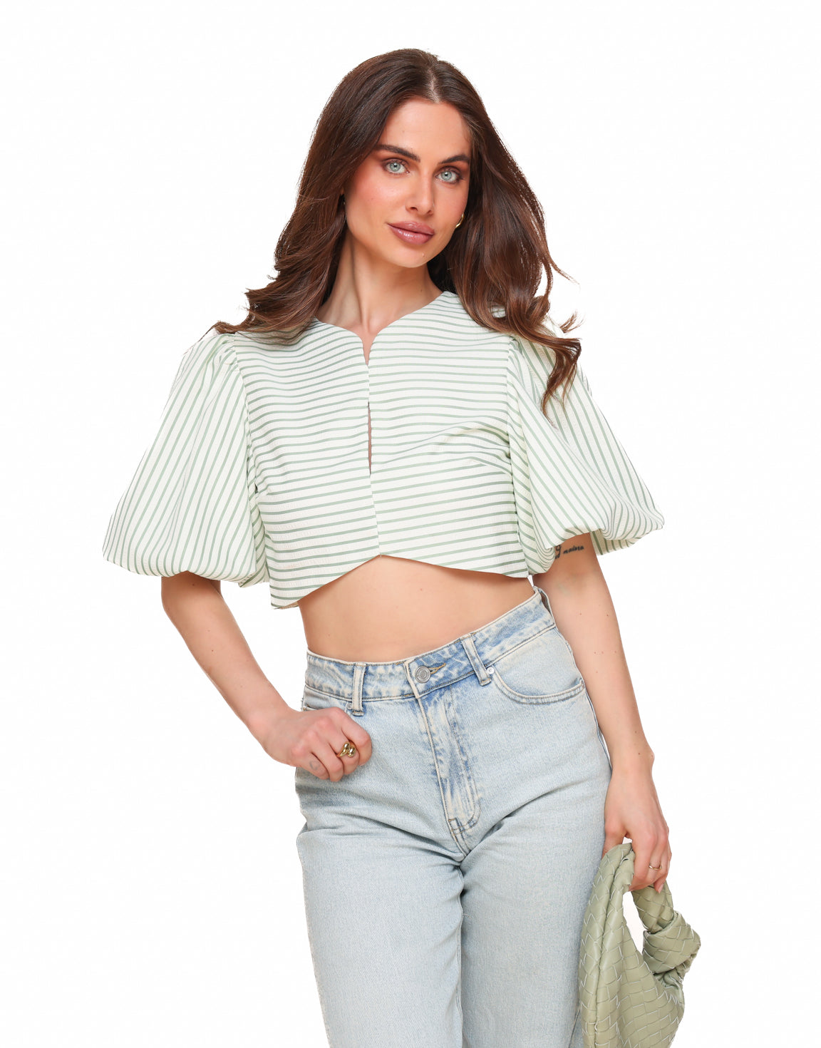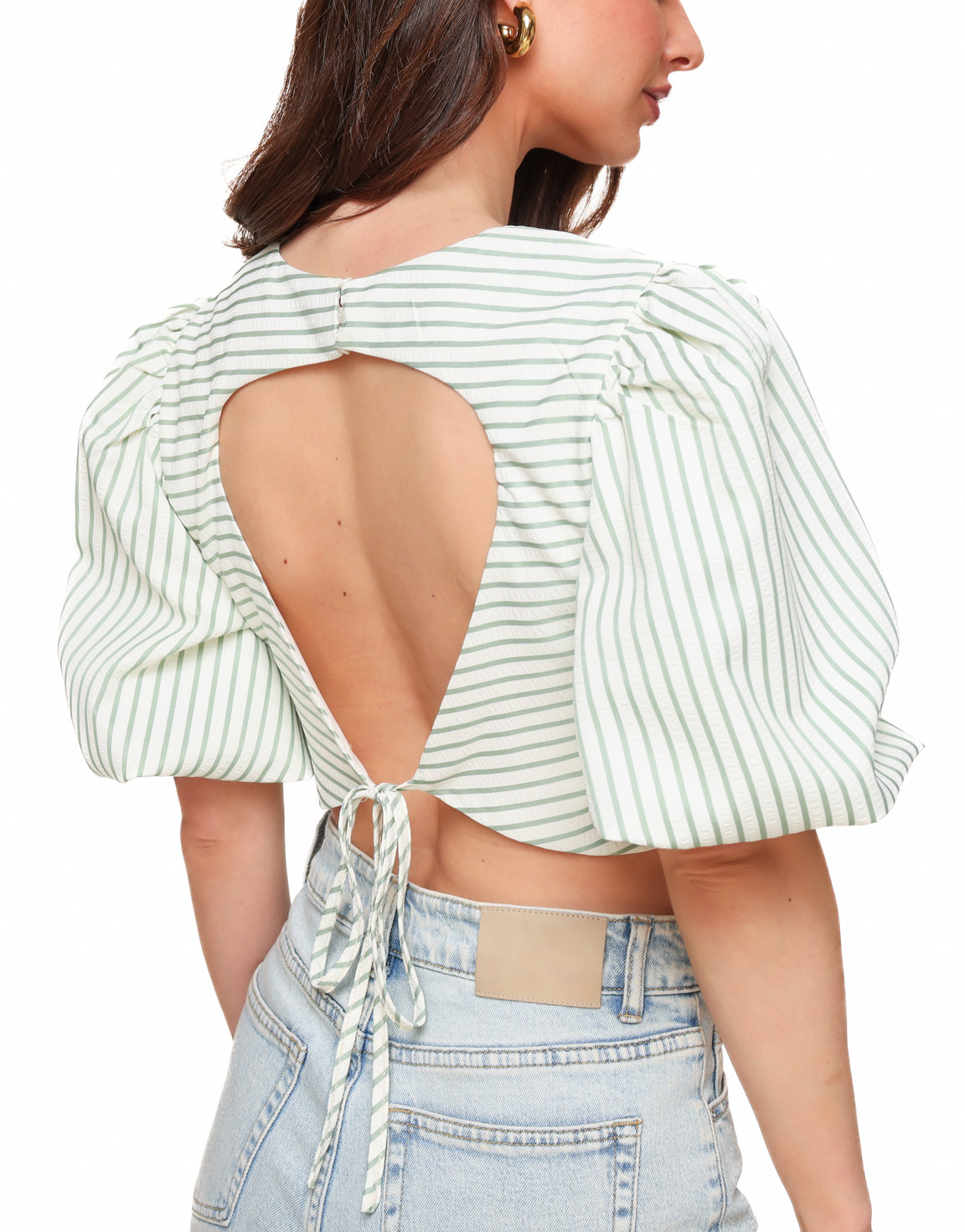 Art. Nr. : 12455- Was advies: handwas- Droger: nee- Details: cropped model / pofmouwen / open rug / ronde hals / knoopsluiting en striksluiting aan achterkant / cut-out aan de voorkant / kleine V-halsย - Model lengte: 173 cm- Model draagt: maat S