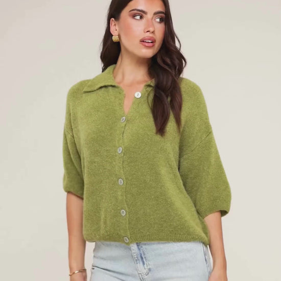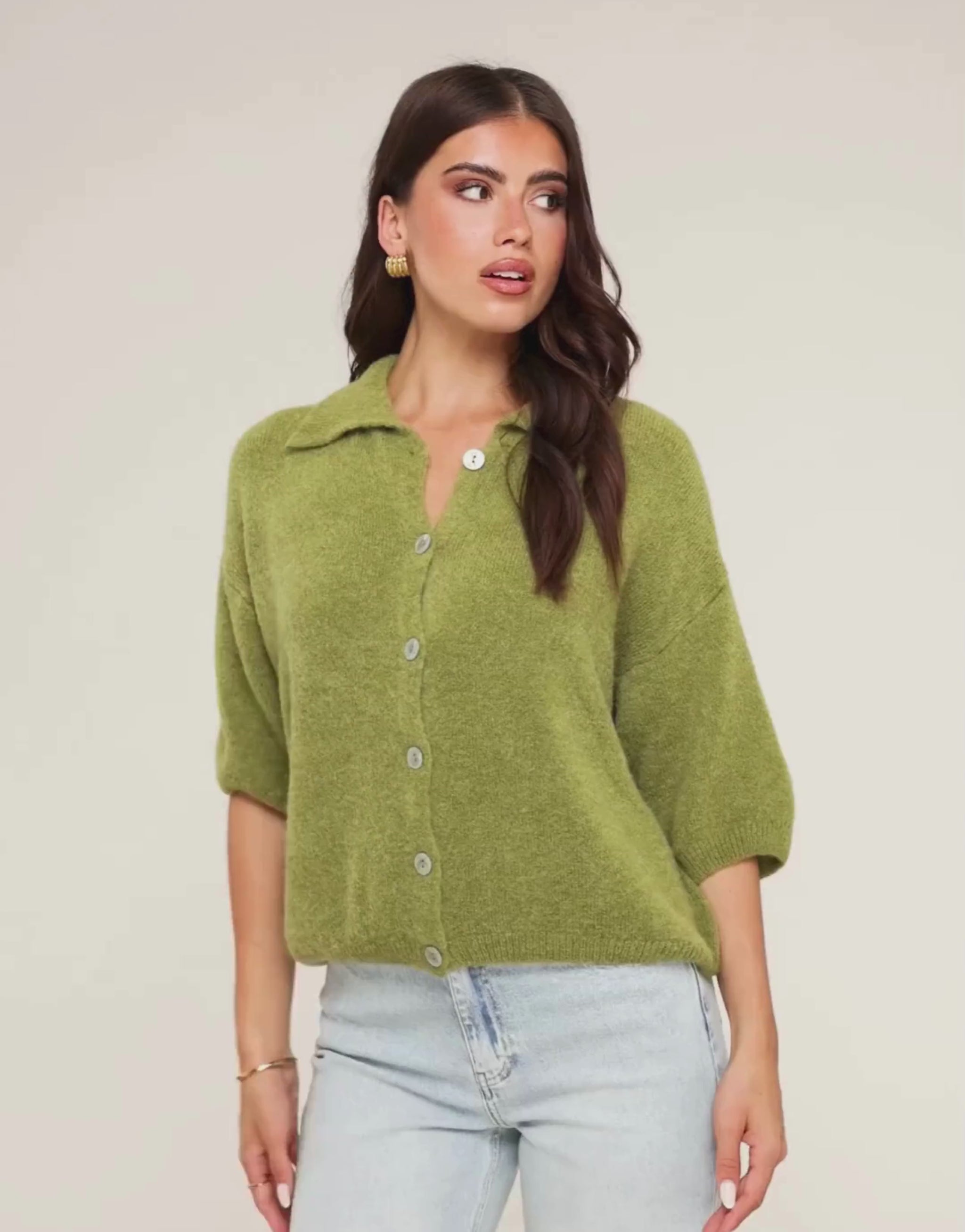 - Wasadvies: handwas- Droger: nee- Details: fluffy top / korte mouwen / stretchy / kraagje / knopen aan de voorkant- Model lengte: 173 cm- Model draagt: S/M