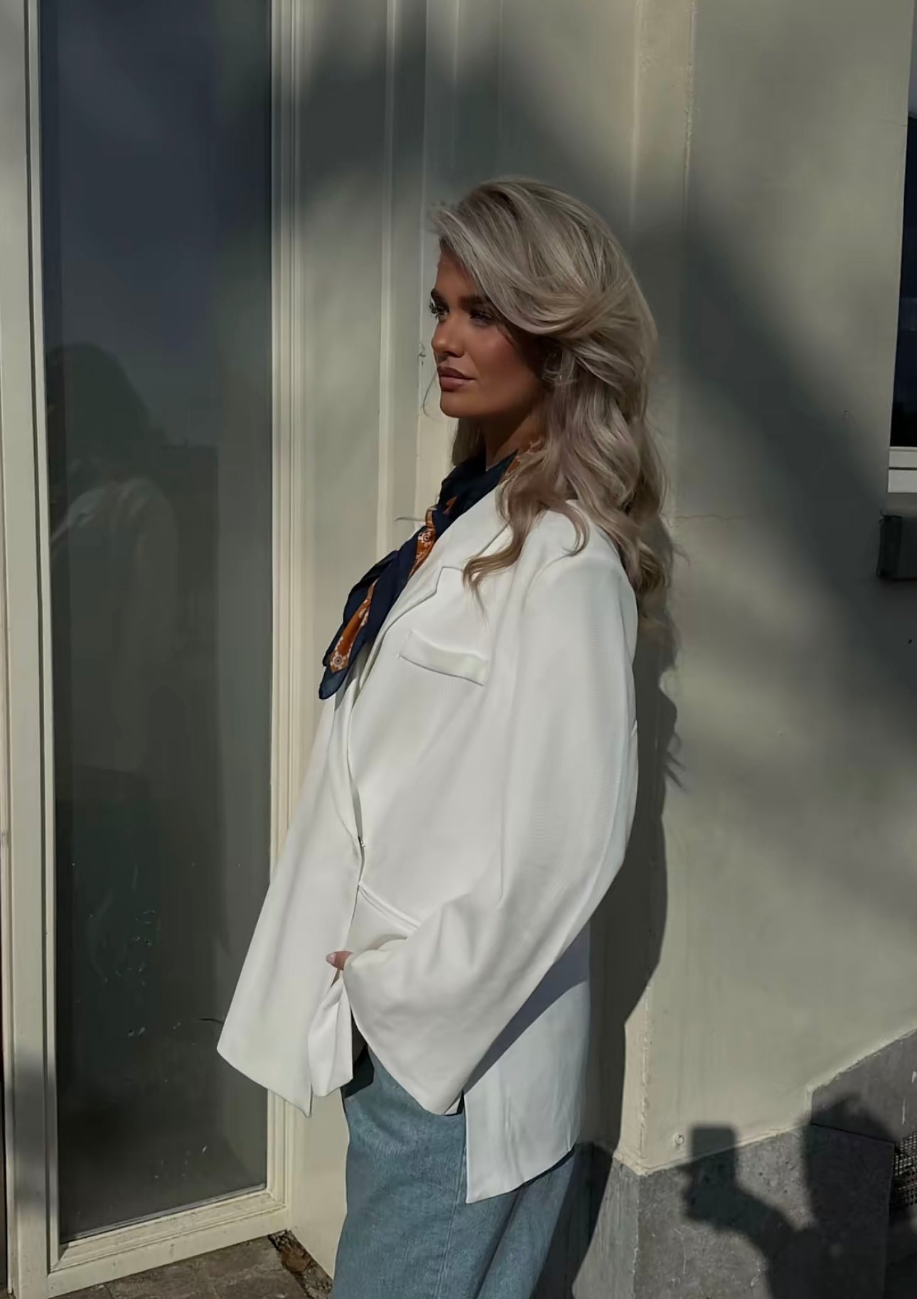 - Wasadvies: 40 graden- Droger: nee- Details: vierkante oversized blazer / lange mouwen / schouder pads / schuine sluiting / druk knoop / twee nep zakken / hoge kraag / split aan het uiteinde van de mouwen- Model lengte: 173 cm- Model draagt: maat S/M